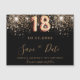 Uma Imã salve a data de moda e moda para a 18ª festa de aniversário. Um fundo preto decorado com falso brilho dourado. Modelos de uma data, nome e texto. Letras coloridas com ouro. O texto: Salvar a Data é gravado com um script de estilo com letra de tendência grande.