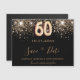 Uma Imã salve a data de moda para uma 60ª festa de aniversário. Um fundo preto decorado com falso brilho dourado. Modelos de uma data, nome e texto. Letras coloridas com ouro. O texto: Salvar a Data é gravado com um script de estilo com letra de tendência grande.