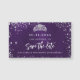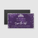 Um cartão magnético "Salve a data" glamouroso para uma Quinceañera, 15 festa de aniversário. Um fundo púrpura incolor. Decorado com faíscas de brilho prateado e uma tiara. O texto: Salvar a Data é gravado com um script de estilo com letra de tendência grande.