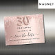 Uma cinta e moda Salve a placa magnética Data para uma festa de aniversário de 30 anos. fundo rosa de gradiente dourado decorado com rosa dourado e gotas luminosas de prata sujas. Personalize e adicione uma data e um nome/texto. O texto: Salvar a Data é gravado com um script de estilo com letra de tendência grande com alternâncias. Número 30 com uma fonte no estilo do balão.