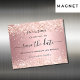 Uma Imã salve a data para uma festa de aniversário (ou qualquer idade). Um fundo metálico cor-de-rosa pincelado decorado com rosa dourado falso brilho, faíscas. Personalize e adicione uma data e nome/idade. O texto: Salvar a Data é gravado com um script de estilo com letra de tendência grande com alternâncias.
