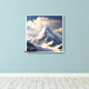 The sky is a deep blue, filled with large, textured clouds that are tinged with gold from the sunlight. These clouds swirl around the mountain, adding to the sense of height and raw, wild beauty. The lower slopes are also covered in snow, with gentle hills and rocky formations leading up to the main peak. The overall effect is a serene and powerful scene of a remote, majestic landscape.