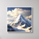 This image shows a grand, snow-covered mountain peak, standing tall against a dramatic sky. The mountain is a mix of rugged, dark rock and brilliant white snow. The warm, golden light of the sun illuminates one side, creating striking highlights and shadows that emphasize the mountain's sharp, natural form.