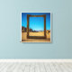 A striking, high-contrast image featuring a large, ornate golden frame standing in a vast, arid desert or rocky plain. The frame perfectly captures a segment of the bright, cloudless deep blue sky and the rugged landscape beyond. Inside the frame, distant, snow-capped mountains rise behind jagged rock formations and sandy terrain. Outside the frame, similar golden-brown rock formations flank the sides, reinforcing the sense of framing a natural, majestic view. The intense sunlight creates deep shadows and highlights the rich texture of the gilded frame and the dry, cracked earth.
