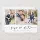 Escolha as melhores fotos de sua filmagem de noivado ou suas fotos favoritas de vocês dois para salvar a data perfeita. As palavras salvar a data são manuscritas para dar uma sensação pessoal ao cartão. A frente tem 3 imagens e a parte traseira tem uma grande imagem com um filtro branco no topo. Edite esta opção para salvar o cartão de casamento de data com suas informações e personalizá-lo para obter mais informações sobre opções de cores de fonte e fonte.