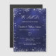 Um moderno e elegante imã de convite para casamento. fundo azul marinho decorado com faxes cintilantes prateados. A cor azul é irregular. Personalize e adicione seus nomes e detalhes da festa. Letras brancas coloridas.