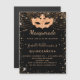 Para um Mascarada elegante, Quinceañera, 15 aniversário. Um fundo na moda preto. Decorado com pó dourado falso e uma máscara de mascarada. Personalize e adicione um nome, idade e detalhes da festa. O nome é escrito com um script de estilo manuscrito