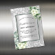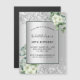 Um imã de convite de na moda. Fundo de aspecto fino prateado decorado com flores brancas, flores, verde eucalipto e brilho falso prateado, faíscas. Personalize e adicione seu nome e detalhes da festa. Letras negras.
