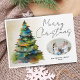 Cartão de Imagem Festivo De Natal De Árvore Artística De Férias De Natal. Desenho de aquarela festiva de uma colorida árvore de Natal com um desejo Feliz de Natal em uma manchete de moda. Personalize o texto e adicione sua foto.