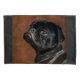Retrato de Black Pug Dog. Um lindo e belo retrato digital de pintura de óleo de cachorro preto. Vestir uma camisa listrada e dar um olhar de lado/olho de baleia, com um fundo castanho escuro e verde. Ricas cores neutras, em tons de terra, com um olhar rústico e aflitivo. Os insetos têm uma personalidade notável e encantadora, apesar do seu pequeno tamanho.