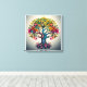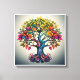 A imagem representa uma árvore vibrante e colorida com um tronco espesso, texturizado e raízes intrincadas. A árvore é enfeitada com uma profusão de folhas em vários tons de verde, amarelo, laranja e vermelho, sugerindo as estações em mudança. A impressão geral é de crescimento, vitalidade, e a interconectividade da natureza.