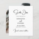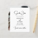 Cartões salve a data modernos e amigáveis com tipografia minimalista negra e branca oferecem uma maneira chique e barato de anunciar seu casamento. Este design de dois lados apresenta uma foto de cheio que mostra sua imagem de noivado favorita, enquanto a frente destaca um layout branco limpo com um texto preto elegante, combinando uma fonte de script na moda com a letra da serif de eterno. Ideal para casais que buscam uma opção de baixo custo, mas sofisticada, essa modelo combina simplicidade e elegância para uma apresentação elegante que ajustado perfeitamente com temas modernos, clássicos ou rústicos de casamento. Projetado para impressionar sem exceder seu orçamento, é perfeito para compartilhar sua data de casamento com estilo e facilidade.