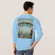 Esta t-shirt mostra uma imagem cômica de um OVNI a pairar sobre uma pequena cidade. O OVNI é uma forma de disco com uma luz azul brilhante no topo. Há pequenas janelas circulares com uma matiz azul clara. O OVNI está pairando sobre uma igreja com uma torre. O fundo tem árvores e casas. A camiseta é uma t-shirt de algodão a 100%.