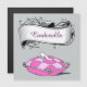 Um modelo de ímã personalizado com letras roxas de script em uma faixa de safra, com uma gravação do escorregador de vidro da Cinderela em um travesseiro rosa.