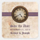 Esses Antigos Relógios Salve os Adesivos de Data apresentam um relógio de vintagem centrado de forma destacada no topo de uma cadeia de esfera metálica e borda roxa listrada elegante. O olhar angustiado do fundo de textura de papel granulado completa a sensação antiquada deste design único. Estes imbecis salvam os adesivos são perfeitos para anunciar o seu casamento de vintage ou steampunk inspirado. Fácil de personalizar, basta adicionar os detalhes do casamento nos espaços fornecidos. Clique em "Personalizar" para encontrar opções adicionais para personalizar este design.
