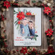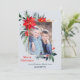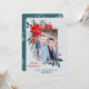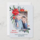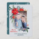 Sua fotografia tira o palco central com uma bonito estrutura de buquê de poinsettia vermelha de cor d'água na parte frontal desta placa Holiday. No fundo está o seu texto personalizado em vermelho e escuro. A parte de trás do cartão é azul-lacrimejo, com uma cobertura branca de floco de neve. Simples elegância para sua foto de família!
