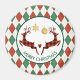Um ímã de férias que diz "Feliz Natal" em texto curvo. Projetado com uma ilustração de 2 cervos de Natal saltando. Os cervejeiros são feitos de xadrez vermelha e preta, com um pouco de coração entre eles. As decorações de Natal com brilho de ouro puro penduram-se no topo. O fundo é um padrão de estilo vermelho e verde.