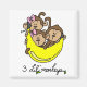 Três pequenos macacos adoráveis penduram na curvatura de uma grande banana amarela em camisetas de macacos 3 Li'l, trajes, cartões, adesivos, sacos de tote e outras roupas de macaco e presentes.