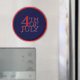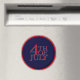 Este design de texto é colorido em vermelho e azul. "4 de julho" é feito em impressão. Uma borda vermelha e um fundo azul foram adicionados. Este design é apresentado em mercadorias sorteadas através da loja de cozinha, Mix e match.