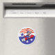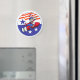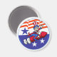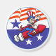 Mostre seu patriotismo com este design de 4 de julho com o tio Sam andando em um foguete com um fundo vermelho, branco e azul.