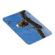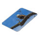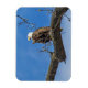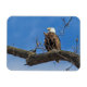 A águia-careca atinge uma pose em um membro da árvore contra um céu azul brilhante.