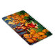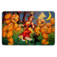 Um ímã engraçado de vintage flexível do Halloween com uma bruxa dançando com personagens de abóbora e seu gato.