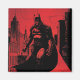 A ilustração do estilo dos quadrinhos de Batman em cima de um gárgula em Gotham City.