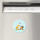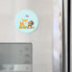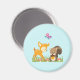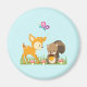 Um ímã com uma ilustração fofinha apresentando um veado bebê e um pequeno esquilo segurando uma bolota e uma borboleta voando sobre suas cabeças. Estas adoráveis criaturas de floresta em pé sobre uma grama com alguns cogumelos brancos perto de seus pés.