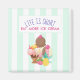 Um ímã com uma citação engraçada com uma ilustração de um sundae de sorvete de 3 furos com bordos coloridos. Um cone de sorvete com colheres de chocolate, morango e baunilha. Uma tigela de sorvete neopolita com uma cereja em cima. Morangos e uma fruta de abacaxi sentam ao lado das tigelas. Padrão de listras brancas e verdes em letras maiúsculas no fundo.