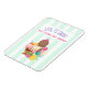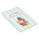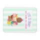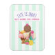 Um ímã flexível com uma citação engraçada com uma ilustração de um sundae de sorvete de 3 furos com bordos coloridos. Um cone de sorvete com colheres de chocolate, morango e baunilha. Uma tigela de sorvete neopolita com uma cereja em cima. Morangos e uma fruta de abacaxi sentam ao lado das tigelas. Padrão de listras brancas e verdes em letras maiúsculas no fundo.