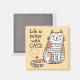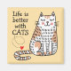 Doodle engraçado de um gato sentado com os olhos fechados, bochechas rosadas e manchas bege. À sua esquerda estão as palavras a vida é melhor com gatos em uma fonte preta divertida. Um pequeno coração de amor vermelho está descendo da letra C e o fundo é de cor bege.