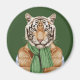 Esta design apresenta um tigre de inverno pronto para vestir seu colete no chão, cachecol verde e suéter de Natal.