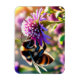 Uma abelha vibrante paira delicadamente sobre uma flor roxa florescente. O corpo listrado da abelha contrasta com as pétalas moles, destacando a beleza da polinização.