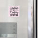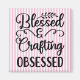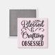 Este ímã "Abençoado e Obcecado" é escrito em um script preto em um fundo listrado rosa.