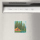 Linda cena do enfumaçado com uma tenda no lago com montanhas e pinheiros ao fundo.