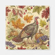 Um peru selvagem está rodeado de abóboras, uvas, bagas, loucos e folhas de outono de cor brilhante, num fundo de natas escuras. Perfeito para Ação de Graças!