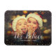 Ímanes de fotos de feriado personalizados impressos com um modelo simples para personalização. Esta design moderna chic tem uma borda de confete falsa e texto de caligrafia na moda. O texto diz "Acreditamos". Personalize-o com suas fotos e adicione seu nome de família e o ano. Use as ferramentas de design para editar o texto, adicionar mais fotos e criar uma única de uma espécie de design de ímã de fotos de Natal.