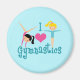 Eu Adoro ginástica. Um presente de ginástica bonito com um texto teal adorável entre duas garotas bonitinhas e um belo coração rosa. Um presente de ginasta bonito para crianças ou treinador de ginástica feminina. Uma morena em uma banca e uma menina loira de braços estendidos.