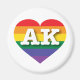 Este ímã apresenta um coração do orgulho do arco-íris contendo as letras maiúsculas, brancas, negros, AK, a abreviação oficial do Alasca, a última fronteira. Mostre suas cores verdadeiras, apoie a igualdade do casamento e comemore a orgulho gay.