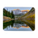 Esta incrível foto do Getty Images apresenta o nascer do sol enquanto ele atinge os picos de neve dos Maroon Bells enquanto é refletido no lago abaixo, junto com as árvores Aspen em sua queda de cheio mostra de cores de ouro.