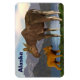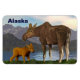 Um alce e seu bezerro bonitinho com um lago e montanhas à distância. A leitura de texto "Alaska" também é exibida.