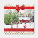 Design de fotos personalizável para seus feriados de Feliz. Padrões de fundo gentis com árvores de Natal em cor de ouro, um quadro de fitas vermelhas e um roteiro de caligrafia de Feliz Natal para o ouro. Personalize alterando a foto e o texto. Feliz Feriados!