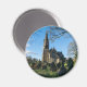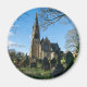 A high-resolution view of the Grade II listed All Saints Church in Salterhebble, West Yorkshire. The image captures the church’s impressive Gothic Revival spire and detailed stonework from the perspective of the historic graveyard. Framed by silhouetted tree branches against a crisp blue sky, the late afternoon sun illuminates the weathered textures of the sandstone, highlighting the architectural heritage of the Calderdale region.