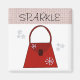 Uma bolsa vermelha e fofa com sotaques de floco de neve. Pequenos flocos de neve no fundo e uma xadrez de borda vermelha no topo. A palavra ‘brilho’ acentua-a.
