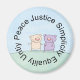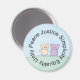 Uma fotografia de dois "Amigos" no centro com as palavras Justiça, Simplicidade, Igualdade, Unidade, Paz são escritas num círculo à volta de George Fox.