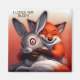 Uma raposa abraça um coelho. O coelho, naturalmente, é perturbado.