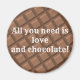 Leitura de texto: "Tudo que você precisa é de amor e chocolate!" sobre um fundo de bar de chocolate
