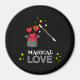 Uma ilustração de uma varinha mágica que faz corações vermelhos saiu de um chapéu com a citação de "Amor Mágico". Você está sonhando em ser um feiticeiro, um mágico ou um ilusionista? Algum feitiço de amor em mente? Celebre seu aniversário, dia de os namorados e amor com seus entes queridos mais românticos e especiais.
