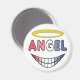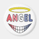 Angel design apresenta um halo com a palavra "Angel" embaixo. Abaixo está um grande sorriso que pode muito bem ser angélico ou talvez principalmente. Uma imagem de anjo divertida e potencialmente irônica.