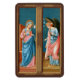 ℣. O Anjo do Senhor declarou a Mary, ℟. E ela concebeu o Espírito Santo." Assim, começa a oração tridiária de Angelus à BVM (Baverna Virgem Maria), que comemora a encarnação na Anunciação. + A Anunciação foi um assunto imensamente popular na arte da Idade Média e do Renascimento. Como composição de duas pessoas, o sujeito emprestou-se a usar nas folhas externas de triptychs: o anjo em uma folha; Mary, na outra. Um triptych é um trabalho de arte—na maioria das vezes uma pintura de painel—que é composto por três partes articuladas de forma que possa ser exibido aberta ou fechada. Aqui, Filippo Lippi (1406-1469) pintou a Anunciação em tempera sobre madeira em pinks quentes, salmões e vermelhos e em blues brilhantes e escuros. Ambas as figuras estão em seus estreitos espaços respectivos, o Arcanjo Gabriel curvando levemente para a gentil e doce donzela Maria. + Santos_Aplvery gosta de um fundo castanho escuro para esta imagem. Um fundo castanho escuro dá aos espectadores a impressão de que eles estão olhando a cena através de uma janela. Mas, como de costume, fornecemos um cartão postal da Paleta de Cores para outras matizes sugeridas. banquete da Anunciação: 25 de março; Banquete de Ruas. Gabriel o Arcanjo: 29 de setembro + Crédito de Imagem (M 038): Imagem antiga da Anunciação de Filippo Lippi (1406-1469) de um cartão postal do final do século XIX na cromolithografia, originalmente publicado por E. Sborgi, Florença, Itália, da coleção privada de efemérsia religiosa do designer. Os painéis originais de um poliptych de origem desconhecida estão na Sala Filippo e Filippino da Galeria Uffizi em Florença. A Anunciação forma as metades superiores das duas folhas enquanto SS. Anthony Abbott e João Batista aparecem no canto inferior esquerdo e no canto inferior direito, respectivamente.